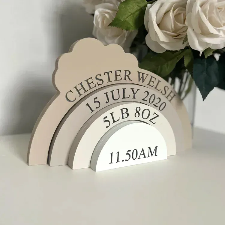 This personalized Cloud Stacking Toy is a unique keepsake designed to celebrate the birth of your baby. Customizable with your baby’s name, birthdate, birth time, and weight, it serves as a memorable and meaningful piece to commemorate the special day. Crafted from high-quality wood, this toy is a beautiful and timeless addition to your baby's nursery.