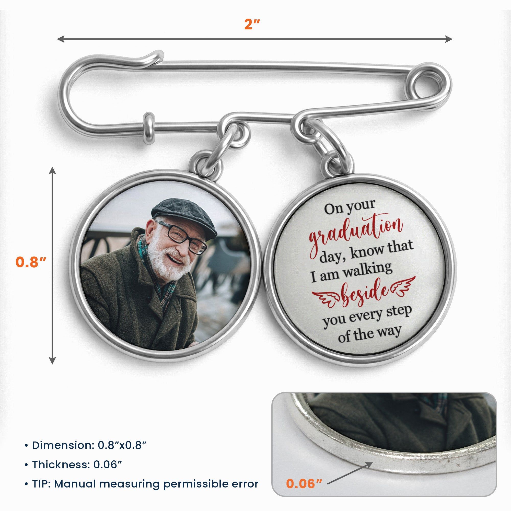 Introducing our perfect keepsake: the Graduation Walking Beside You Every Step lapel pin. It's not just an accessory; it encapsulates a tangible piece of memory. This personalized lapel pin comes with photo charms that tell a tale of unforgettable moments and shared sentiments. The lapel pin makes a beautiful memento to own, cherishing the day of proud achievement during graduation. The product captures the sense of togetherness, a constant reminder that the graduate is never alone in their journey.