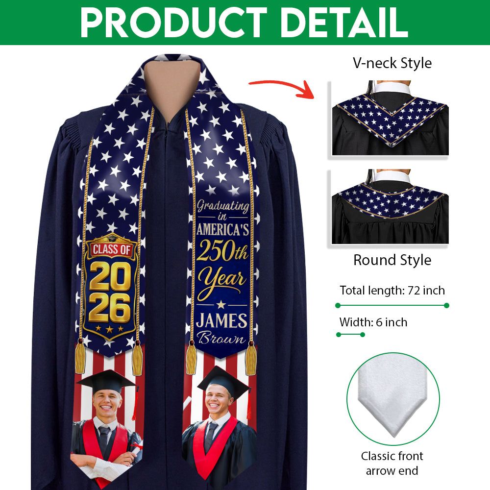 Celebrate your achievement with this custom photo Class of 2026 graduation stole, honoring America’s 250th year. Personalized with your photo, it adds a unique and patriotic touch to your graduation outfit. Designed with bold USA-inspired elements, it helps you stand out on your special day. A meaningful keepsake to remember this historic milestone and your accomplishment.