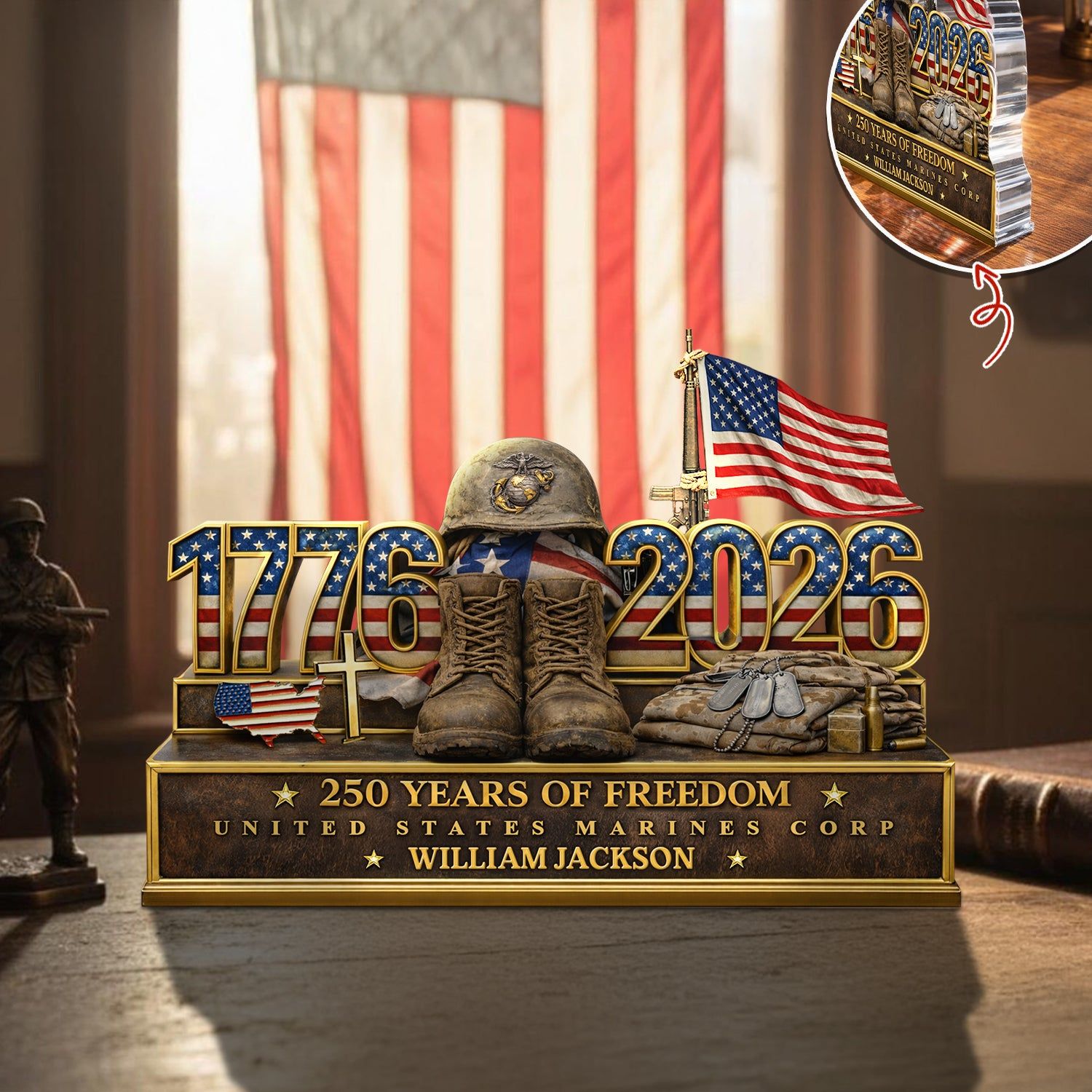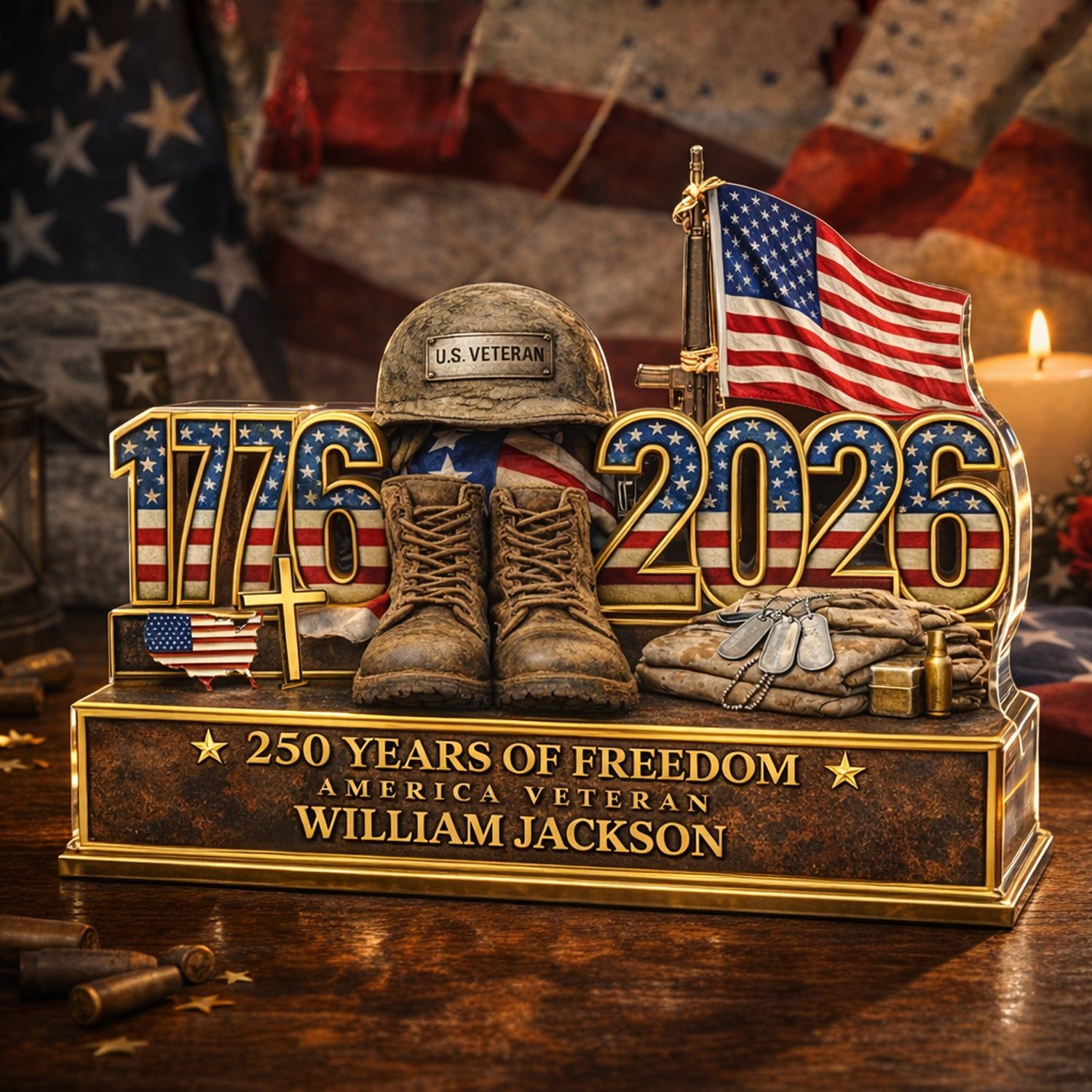 Celebrate 250 years of American independence with this stunning personalized acrylic block plaque. Perfect as a veteran gift or patriotic memorial decor, this keepsake honors freedom and service with timeless elegance. Crafted from crystal-clear acrylic with a striking 3D printed effect, this freestanding plaque requires no base and makes an impressive display on desks, shelves, or mantels. The front features your personalized design with vibrant, lifelike colors, while the reverse displays a beautiful mirrored reflection. This versatile piece works beautifully as a military memorial, patriotic home accent, or meaningful gift for those who've served.