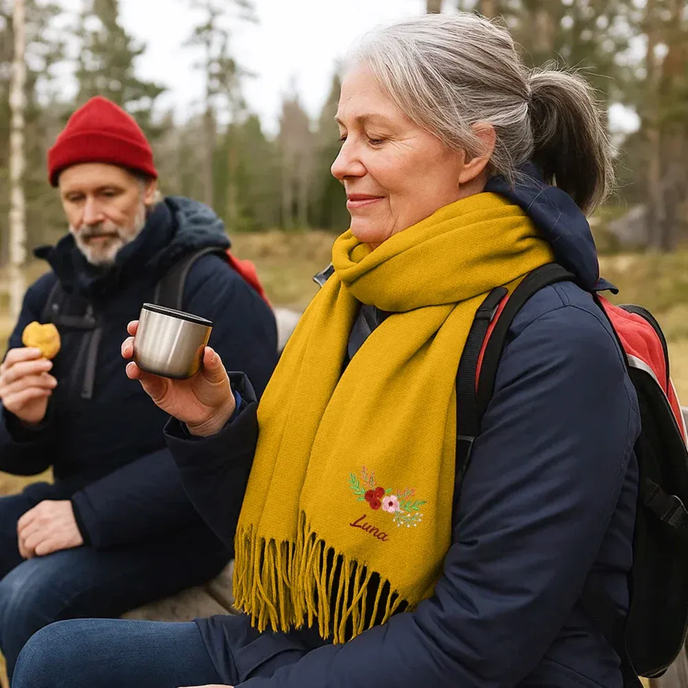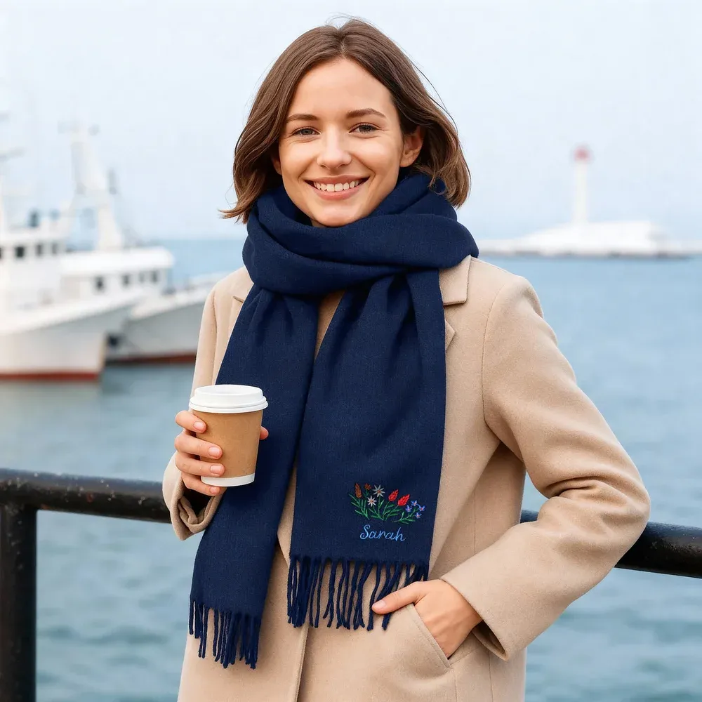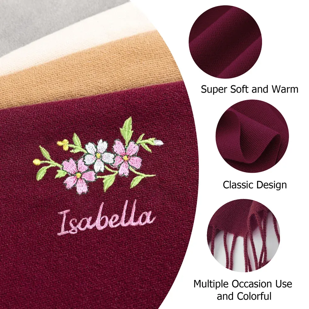 Personalized Colorful Embroidered Floral Soft Warm Tassel Scarf with Name Anniversary Birthday Gift for Women
