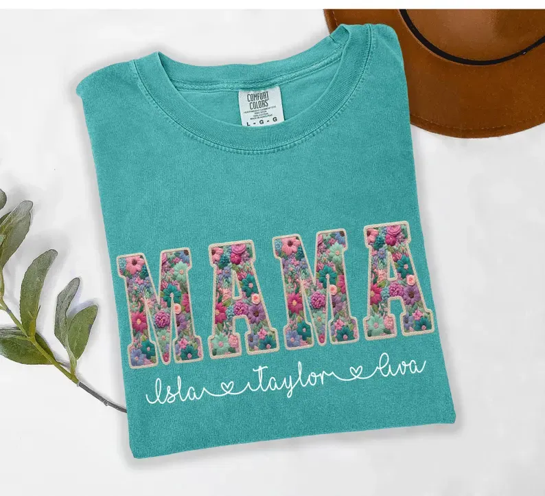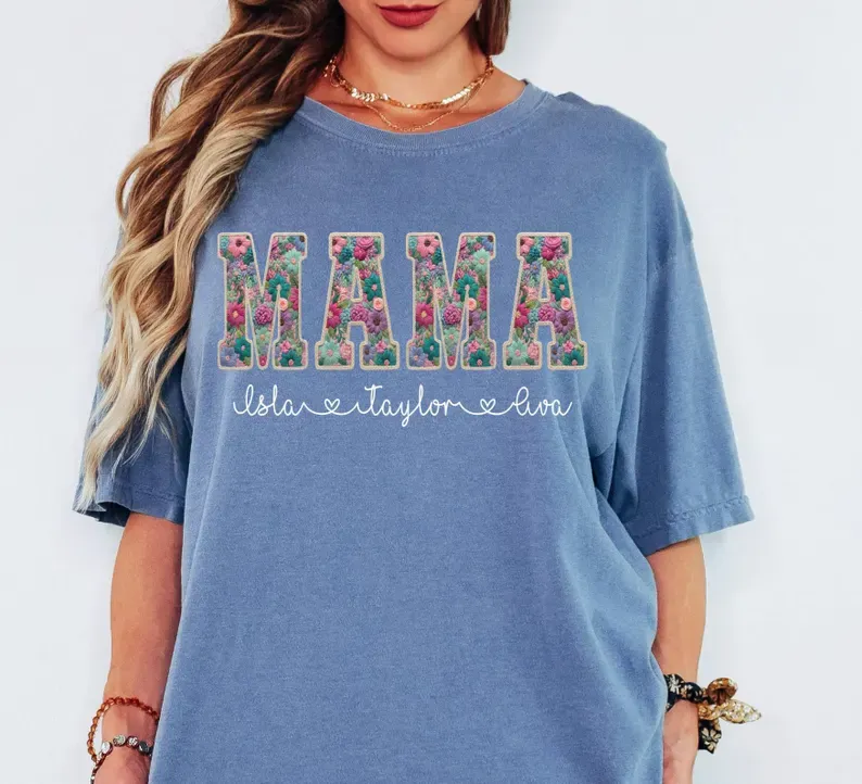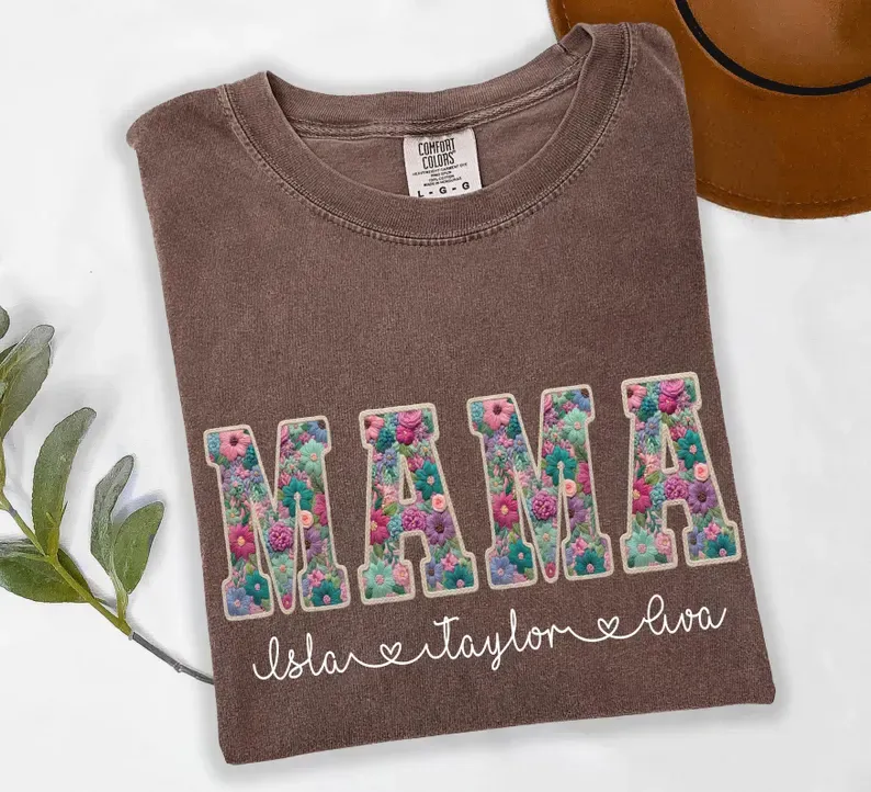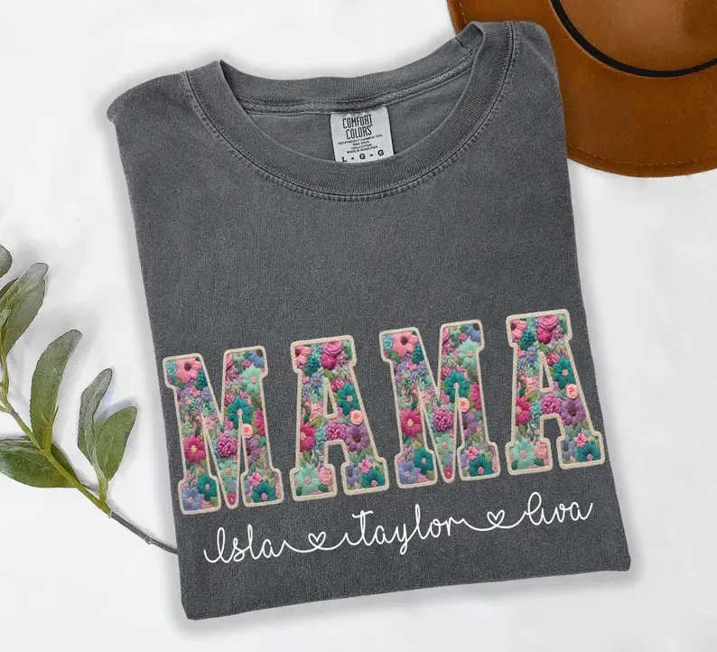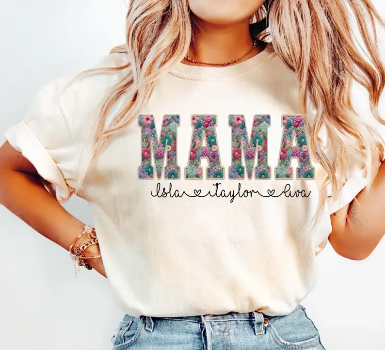 Personalized Mama Shirt With Kids Names Faux Embroidery Effect Mama Gift For Mothers Day Custom Mom Gift